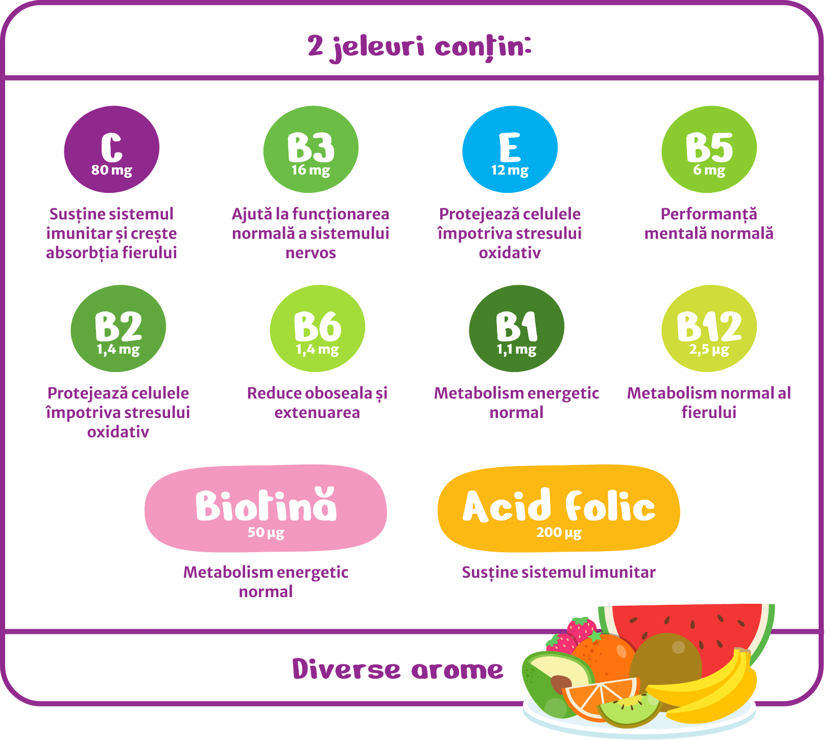 - include aproape 100% din doza zilnică recomandată de vitamine esențiale