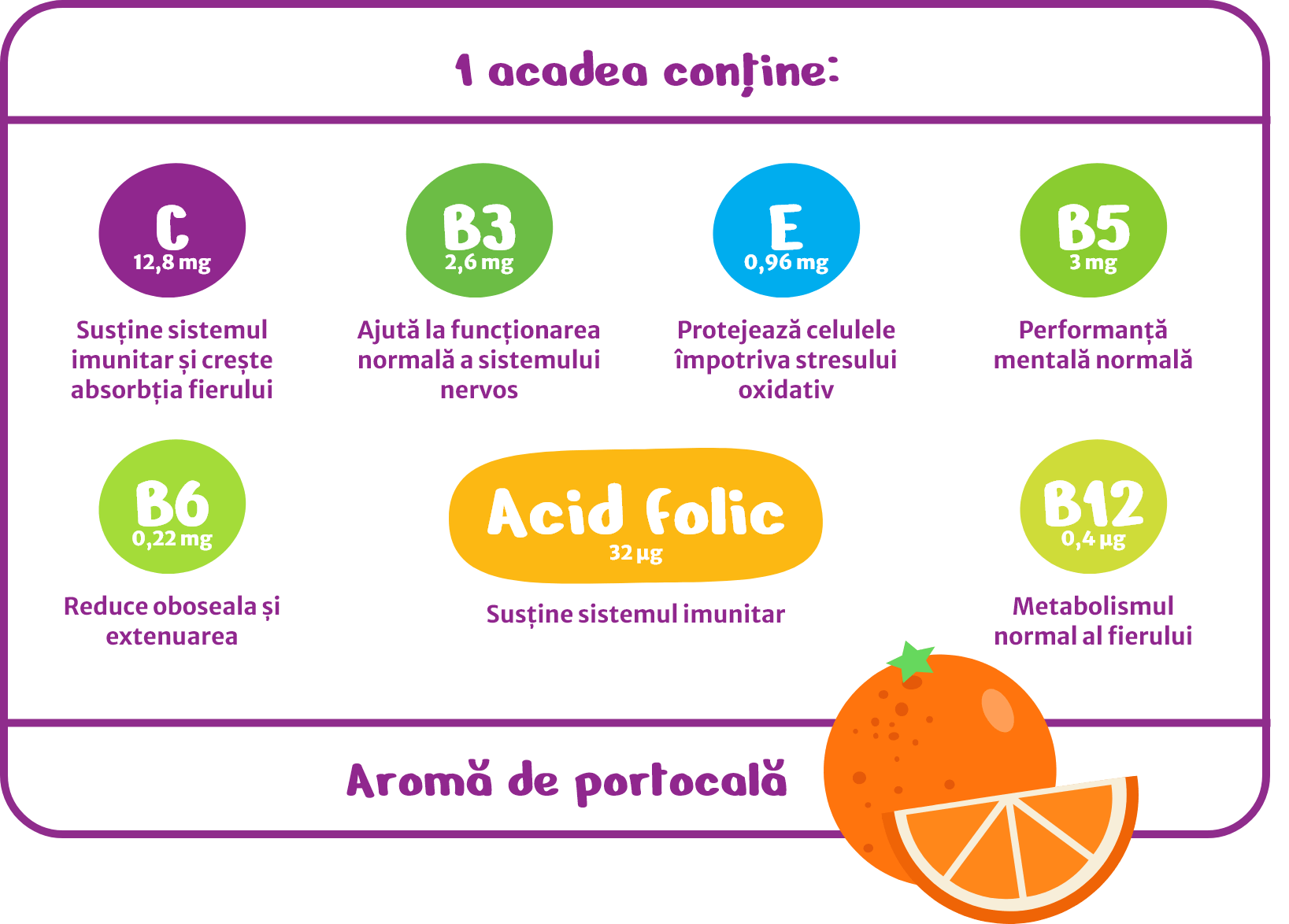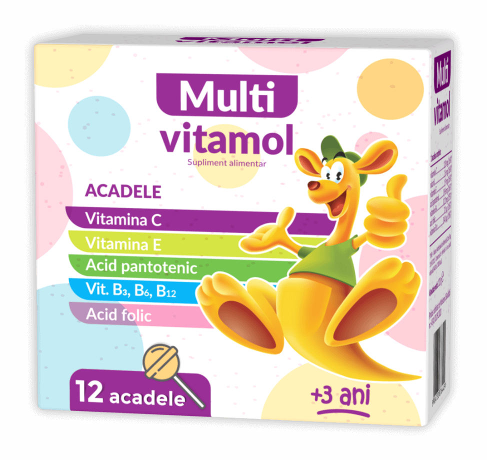MultiVitamol 12 ACADELE - Combinație de 7 vitamine esențiale de care copiii peste 3 anișori au nevoie pentru o creștere și dezvoltare sănătoasă.